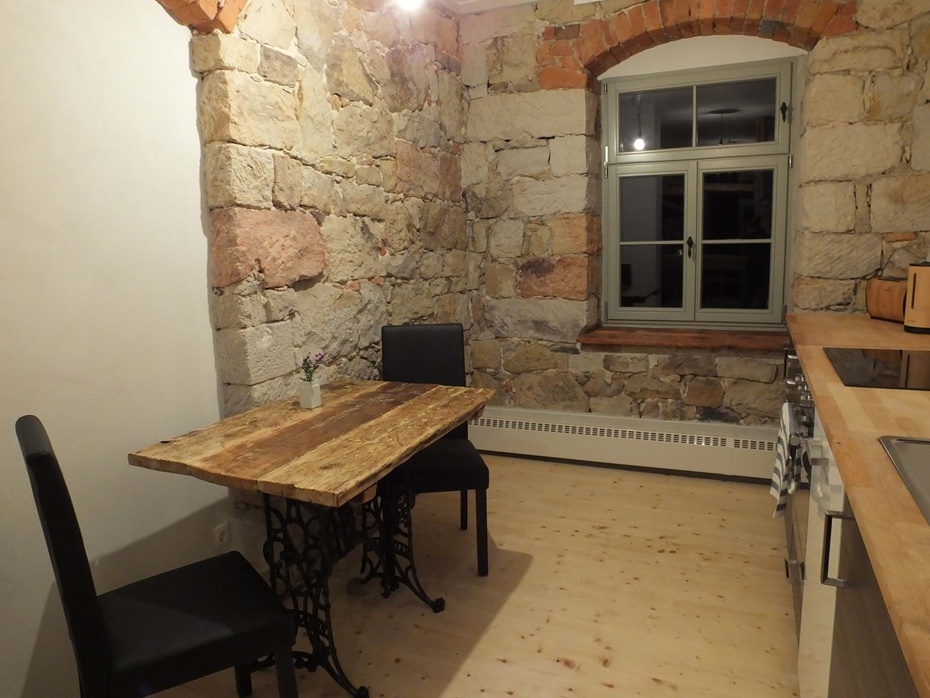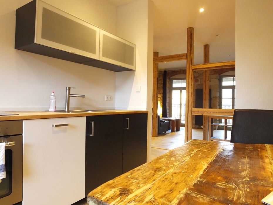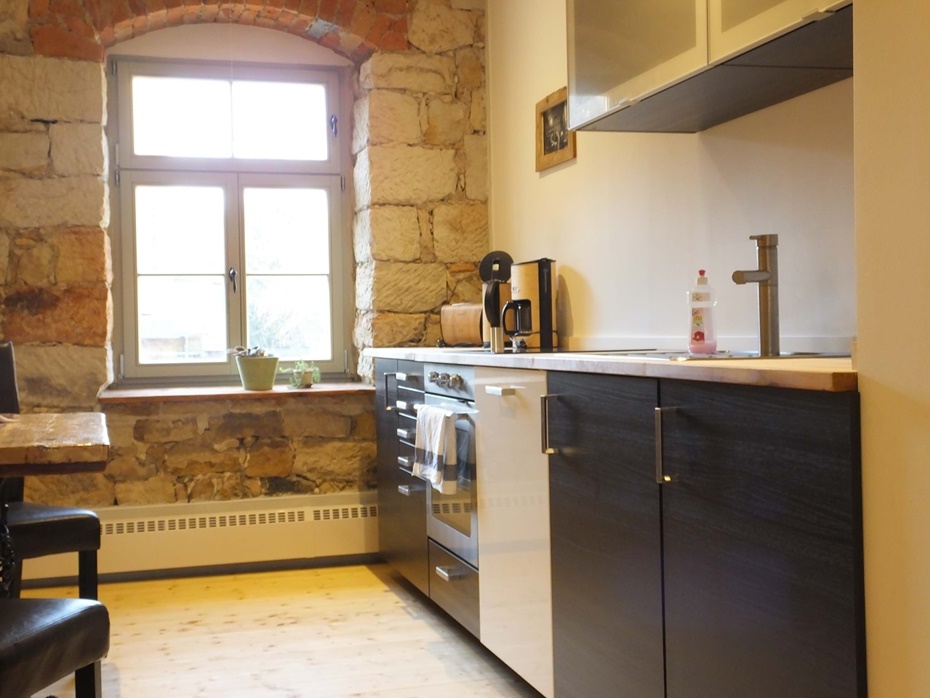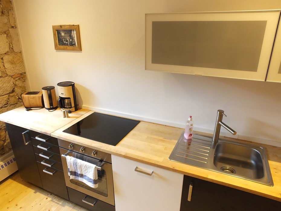 Küche Kühlschrank mit Gefrierfach, Induktionskochfeld, Backofen, Geschirrspüler, Wasserkocher, Kaffeemaschine, Toaster, Esstisch