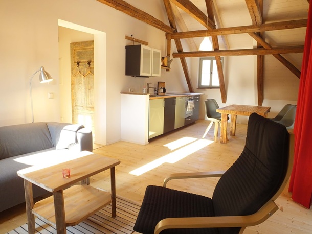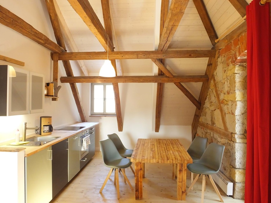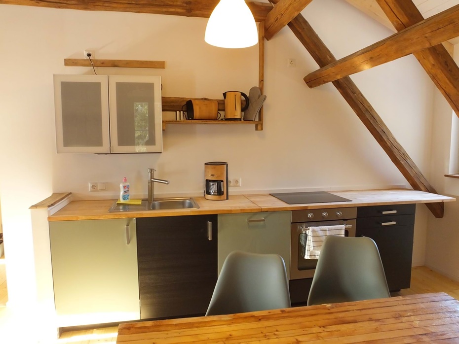 Küche Kühlschrank mit Gefrierfach, Induktionskochfeld, Backofen, Geschirrspüler, Wasserkocher, Kaffeemaschine, Toaster, Esstisch