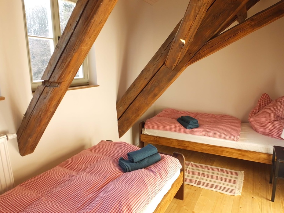 2 Schlafzimmer mit 1 x Doppelbett und 2 x Einzelbetten