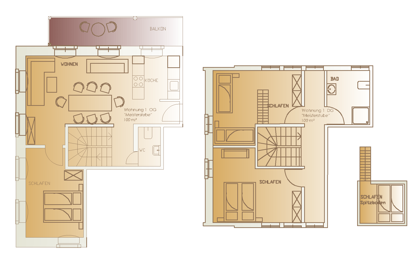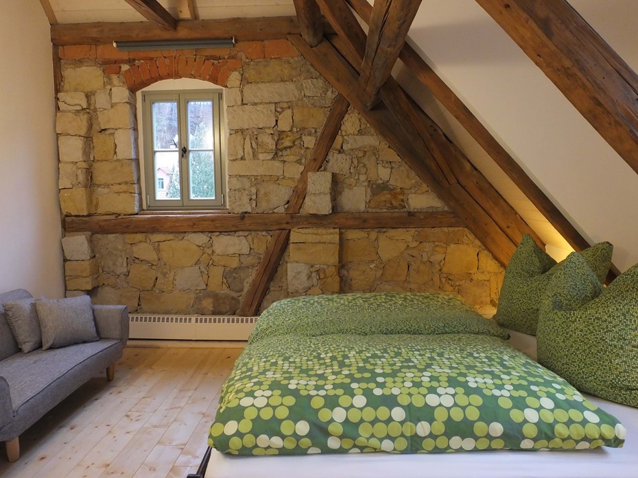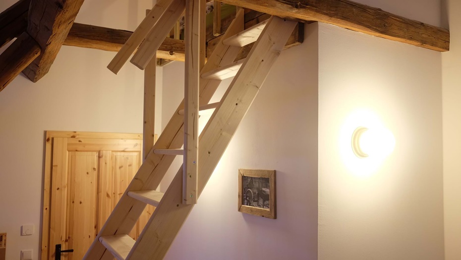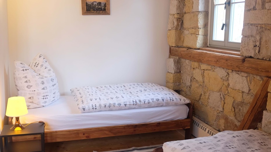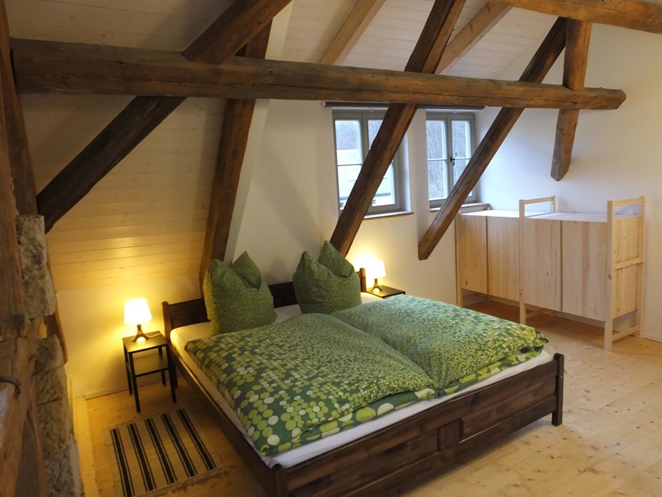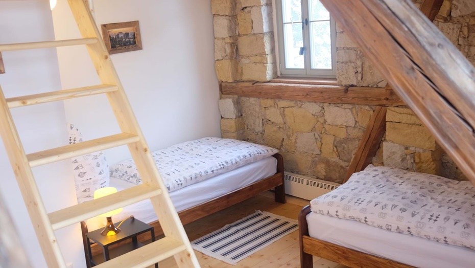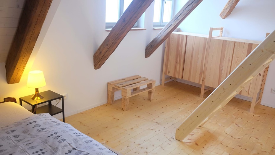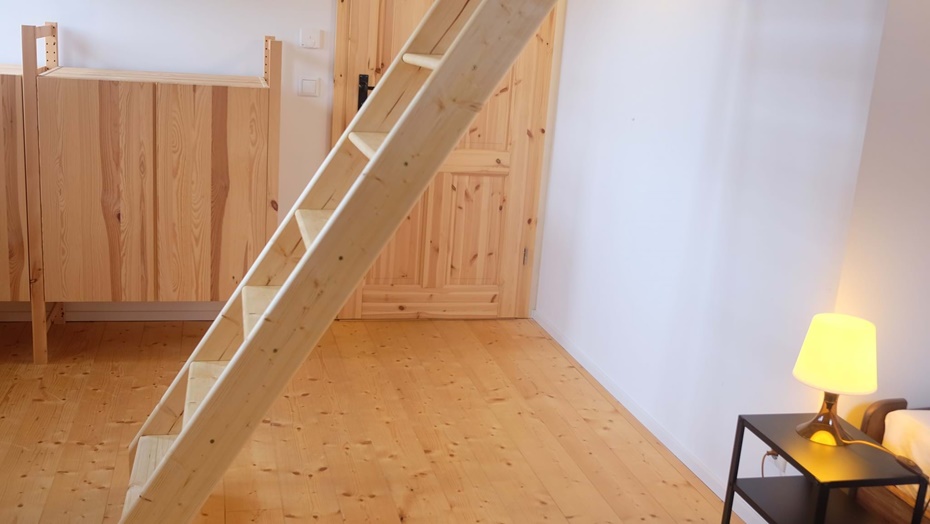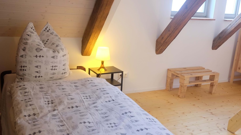 1 Schlafzimmer mit 2 x Einzelbetten und 1 Doppelbett (Breite 1,40m) auf offenem Schlafboden