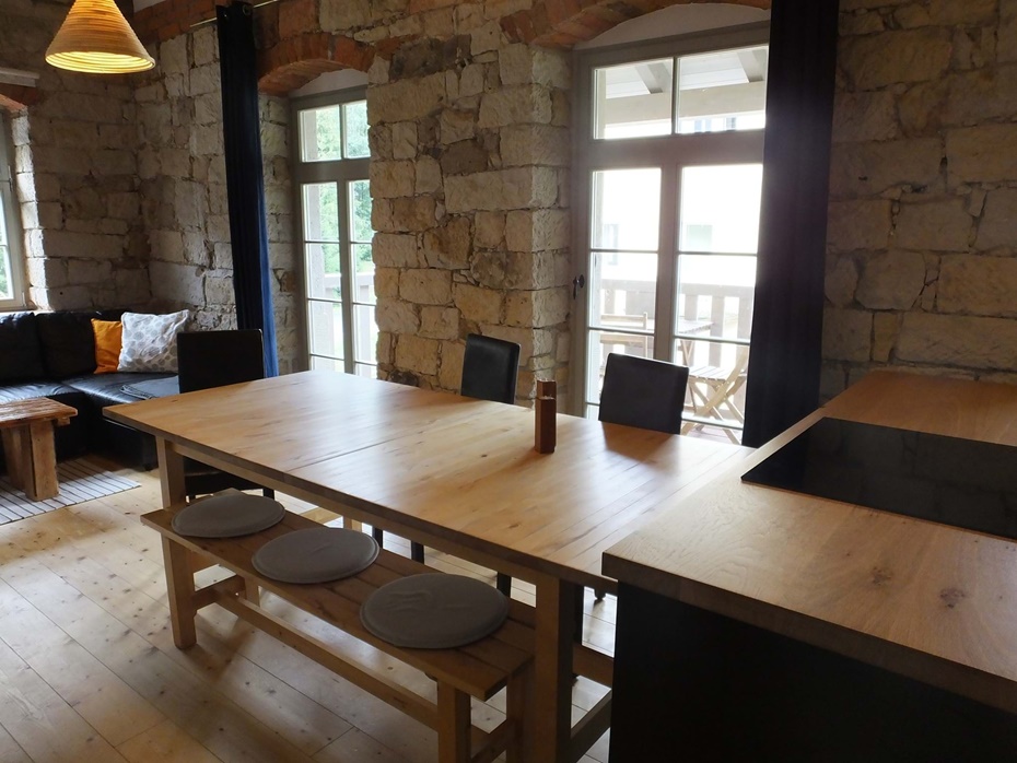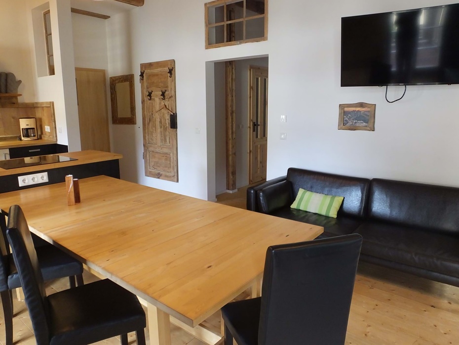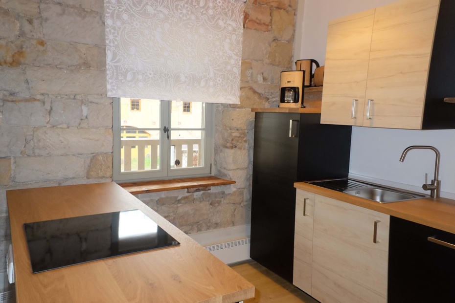Küche Kühlschrank mit Gefrierfach, Induktionskochfeld, Backofen, Geschirrspüler, Wasserkocher, Kaffeemaschine, Toaster, Esstisch
